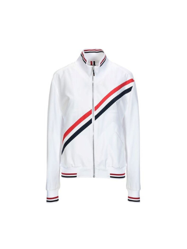 The front features a heavy-duty zipper closure that leads up to a sleek stand-up collar, giving the piece a modern, streamlined silhouette. To ensure a secure fit and trap warmth, the full-length sleeves are finished with rib-knitted cuffs. You’ll have ample storage for your gear with two side waist pockets and two inner side pockets for your phone and wallet. Finished in a crisp white color accented by sharp red and black stripes, this bomber jacket is a dependable showstopper that pairs perfectly with dark denim or streetwear.
